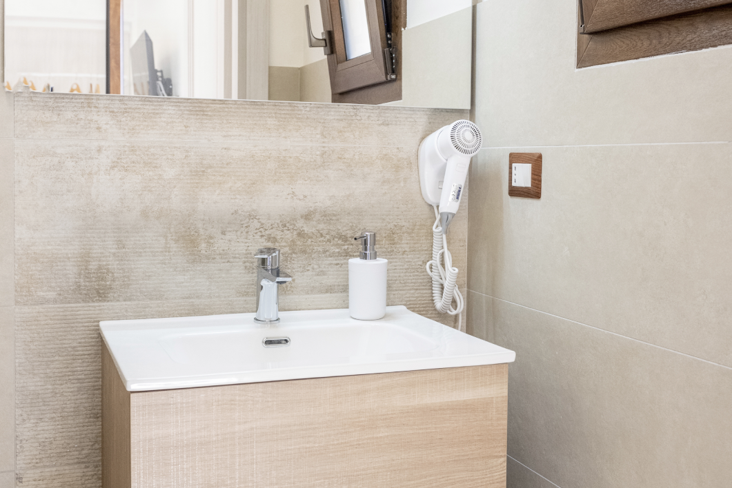 Una camera è dedicata alle esigenze speciali di persone con ridotta mobilità, priva di barriere architettoniche e dotata di servizi specifici come un ingresso più ampio, bagno e doccia con supporti adatti.